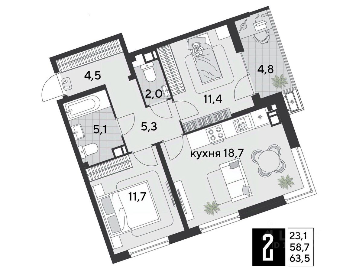 1 кв. 2026, общей площадью 63.5 кв.м., на 8 этаже.