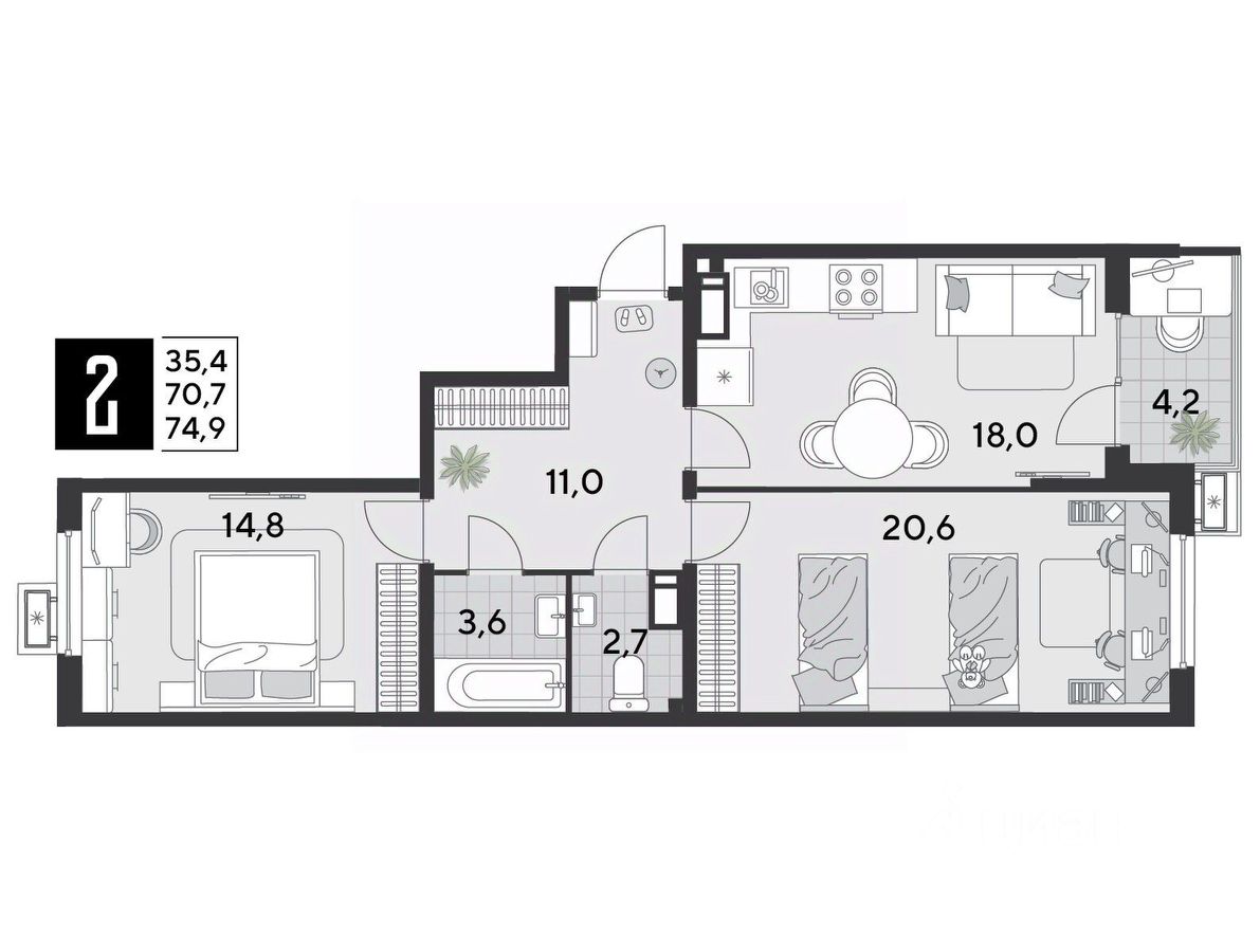 1 кв. 2026, общей площадью 74.9 кв.м., на 18 этаже.