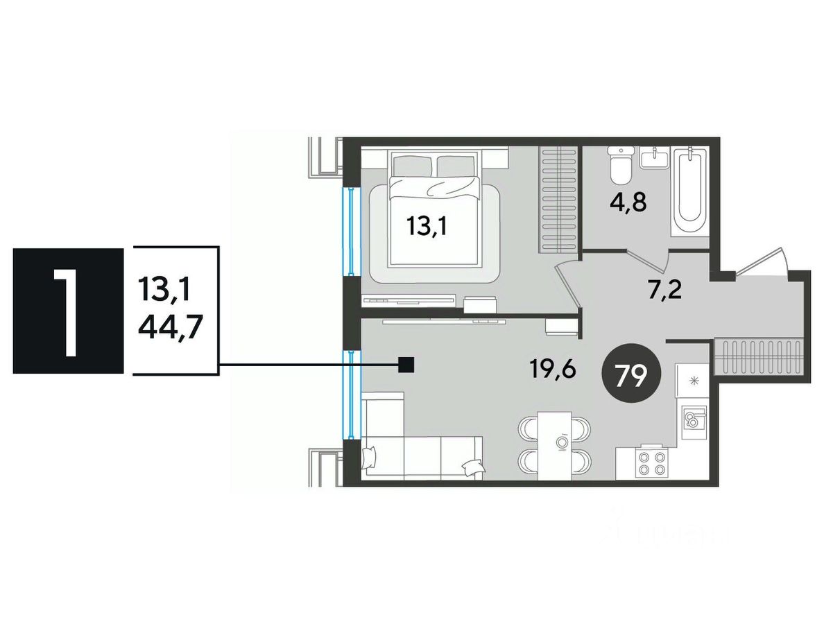 1 кв. 2026, общей площадью 44.7 кв.м., на 2 этаже.