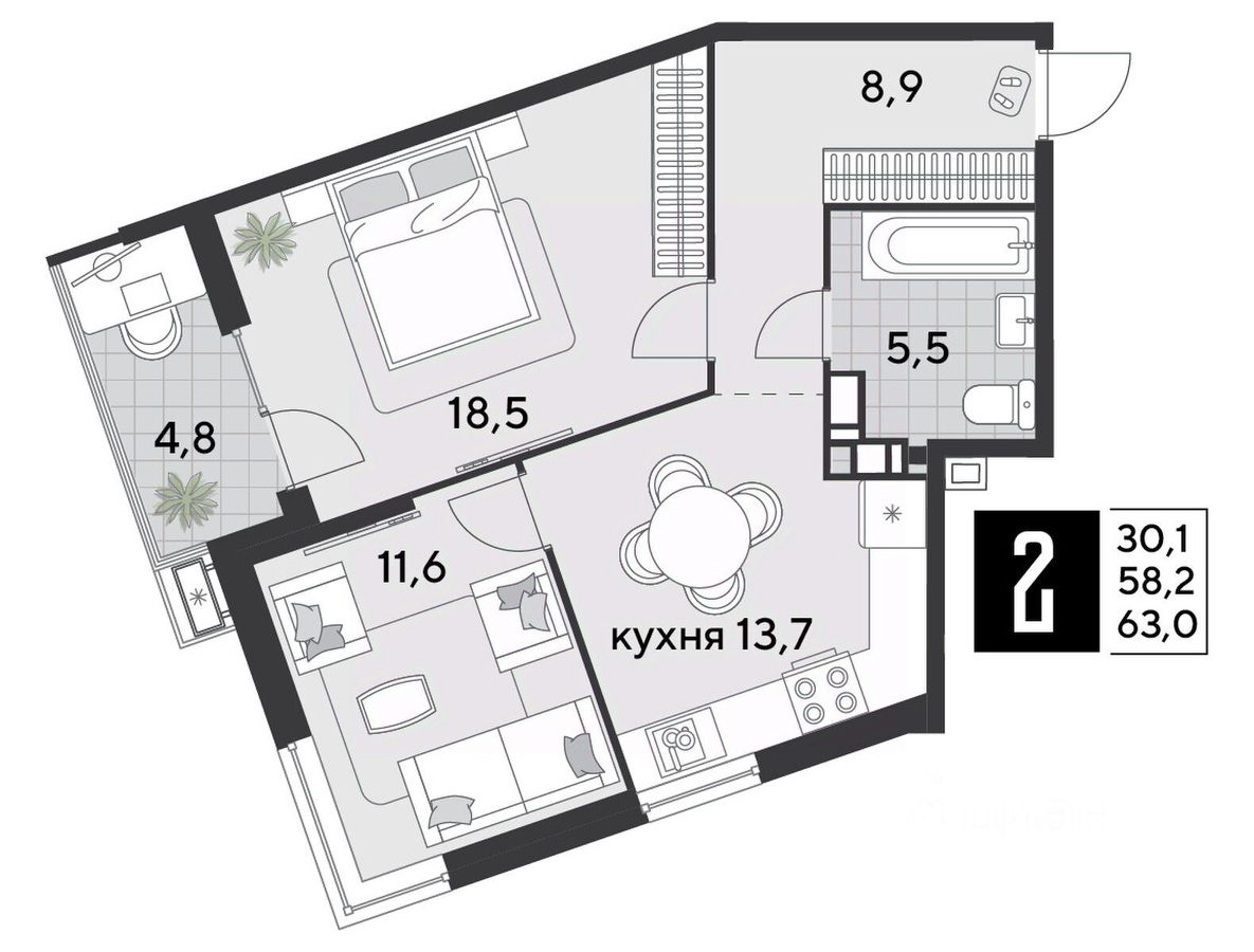 1 кв. 2026, общей площадью 63 кв.м., на 11 этаже.