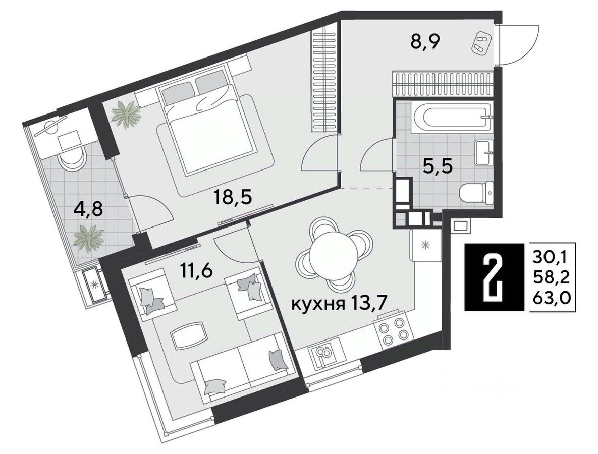 1 кв. 2026, общей площадью 63 кв.м., на 16 этаже.