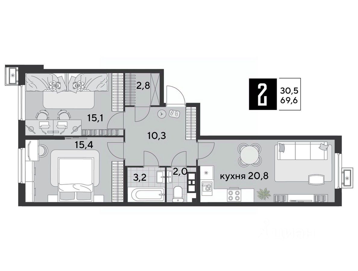 1 кв. 2026, общей площадью 69.6 кв.м., на 7 этаже.