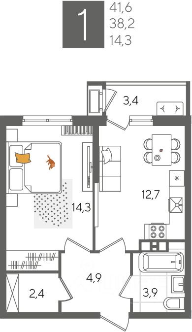 В продаже 1-комнатная квартира от застройщика! ЖК "Рекорд" 2 очередь, г. Краснодар, Литер 5 Срок сдачи: 4 кв. 2026, общей площадью 41.6 кв.м., на 4 этаже.