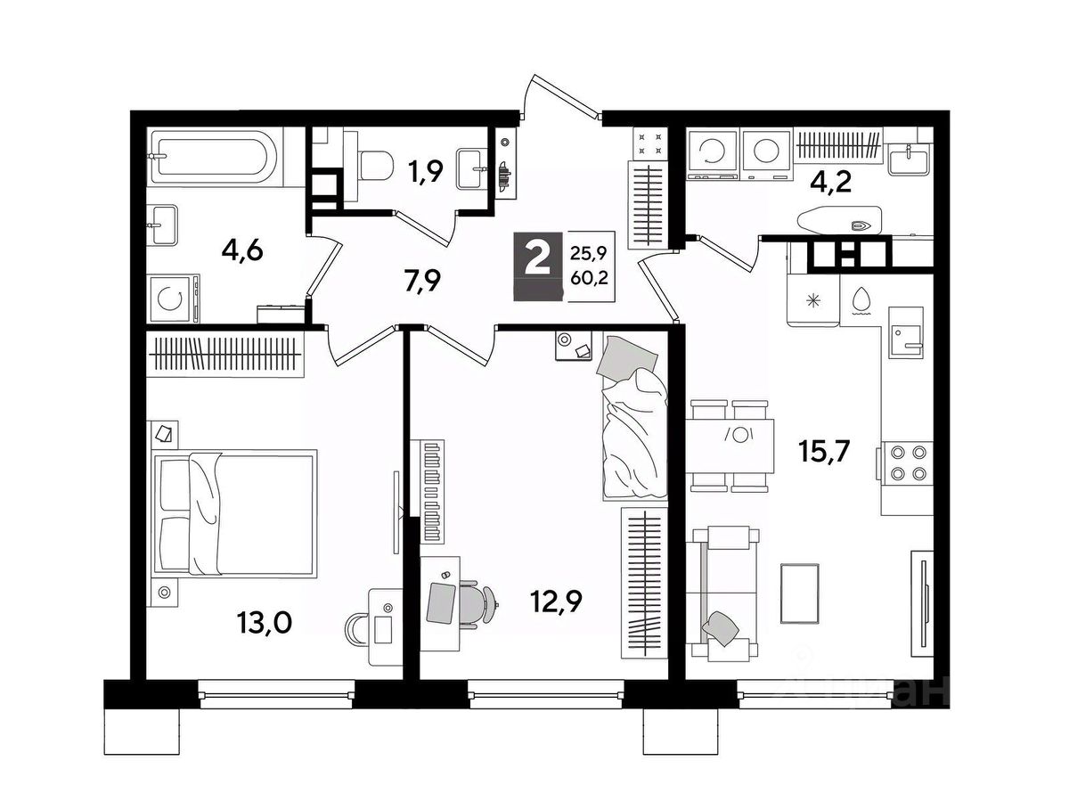 В продаже 2-комнатная квартира от застройщика! Мкр. "DOGMA PARK" г. Краснодар, Литер 13 Срок сдачи: 4 кв. 2027, общей площадью 60.2 кв.м., на 3 этаже.