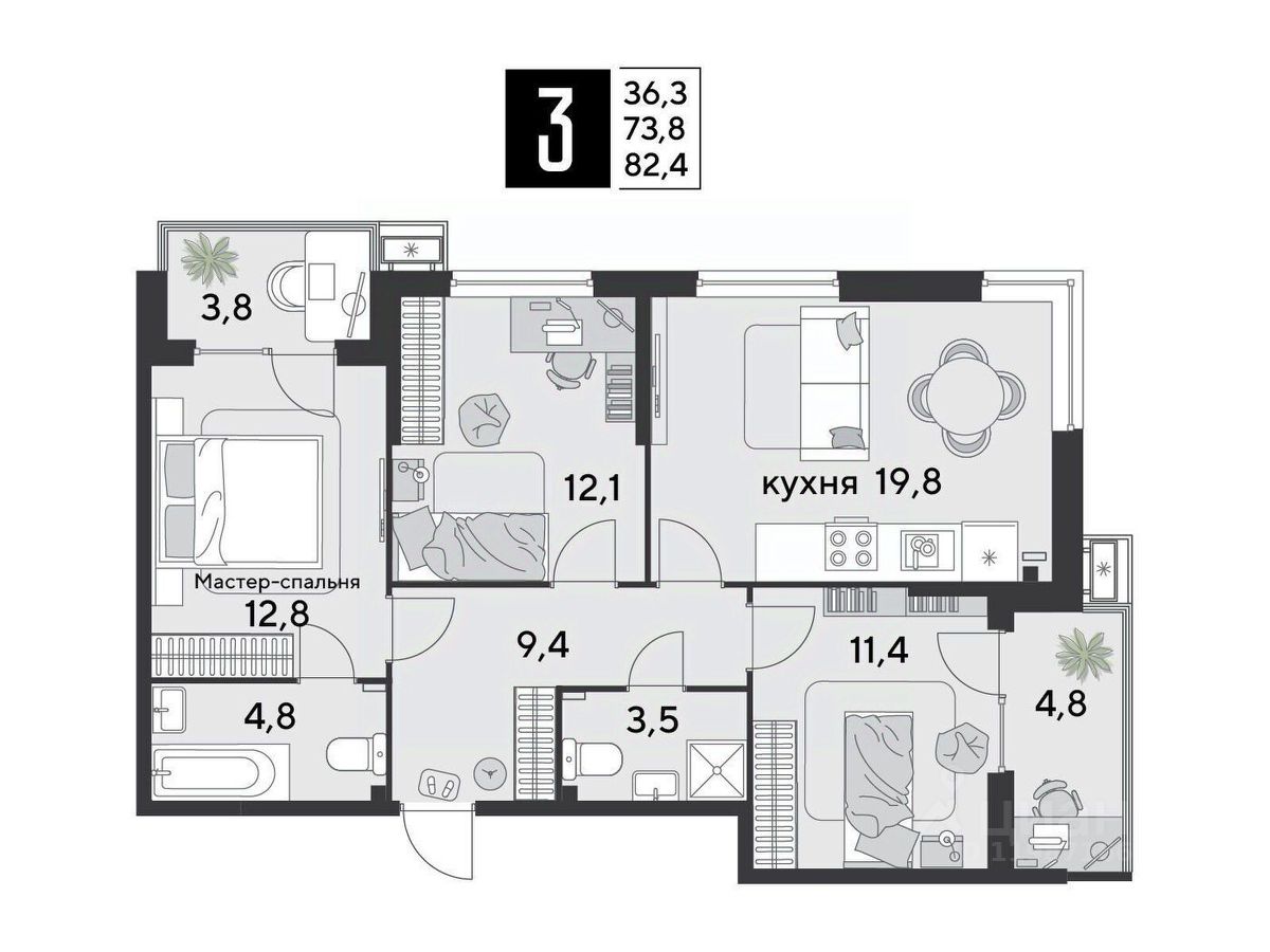Срок сдачи: 4 кв. 2025, общей площадью 82.4 кв.м., на 2 этаже.