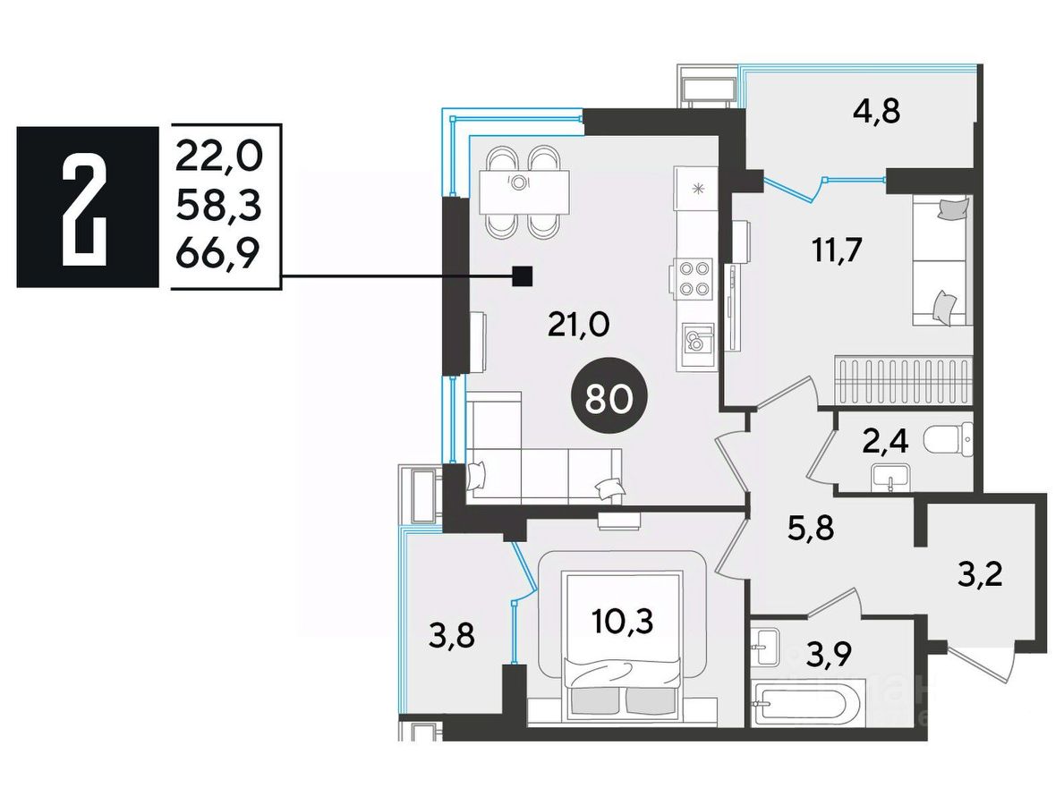 Срок сдачи: 1 кв. 2026, общей площадью 66.9 кв.м., на 4 этаже.