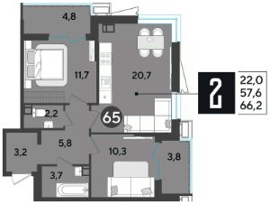Срок сдачи: 1 кв. 2026, общей площадью 66.8 кв.м., на 7 этаже.
