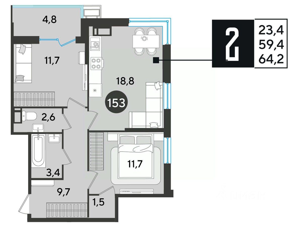 Срок сдачи: 1 кв. 2026, общей площадью 64.2 кв.м., на 7 этаже.