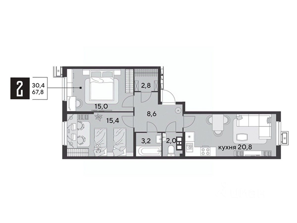 Срок сдачи: 1 кв. 2026, общей площадью 66.7 кв.м., на 9 этаже.
