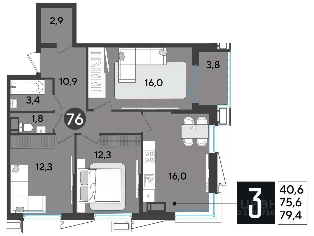 Срок сдачи: 1 кв. 2026, общей площадью 78.9 кв.м., на 12 этаже.