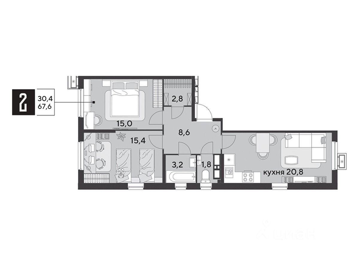 Срок сдачи: 1 кв. 2026, общей площадью 66.7 кв.м., на 13 этаже.