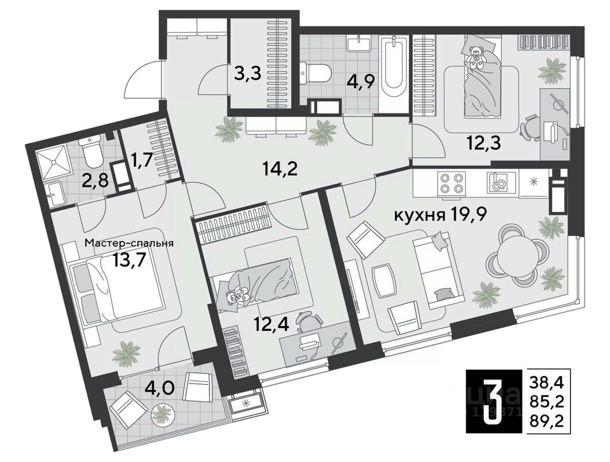 Срок сдачи: 1 кв. 2026, общей площадью 89.2 кв.м., на 2 этаже.