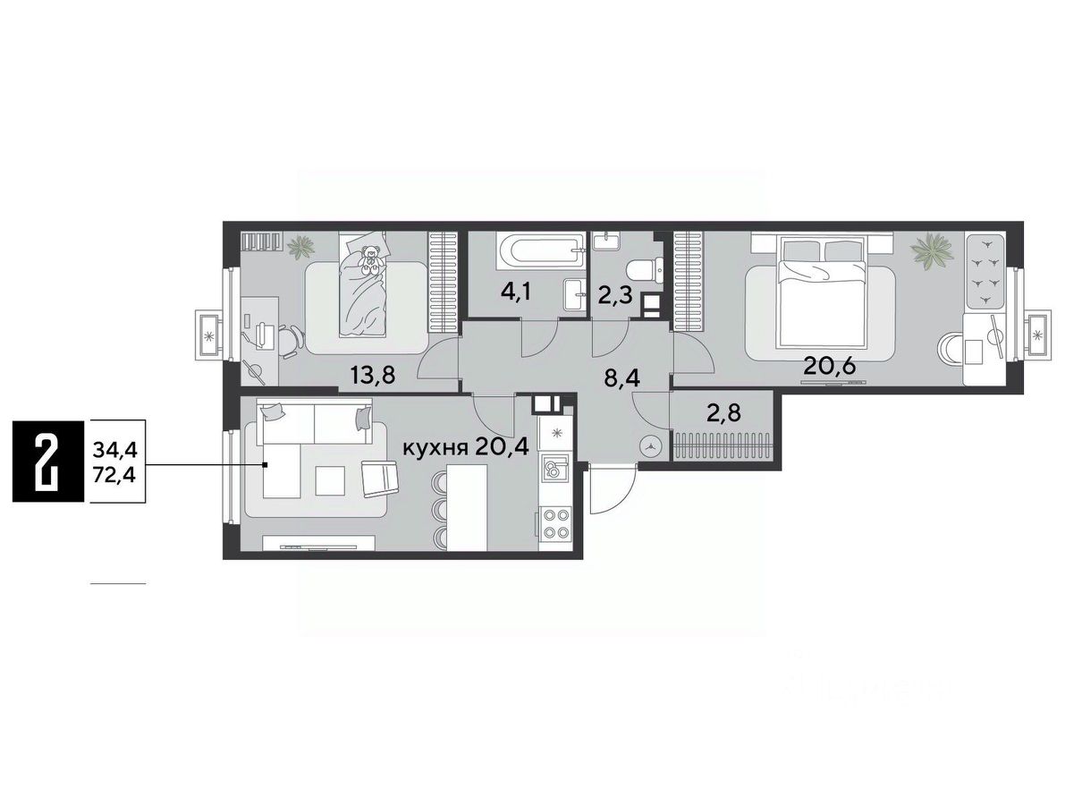 Срок сдачи: 1 кв. 2026, общей площадью 71.2 кв.м., на 9 этаже.