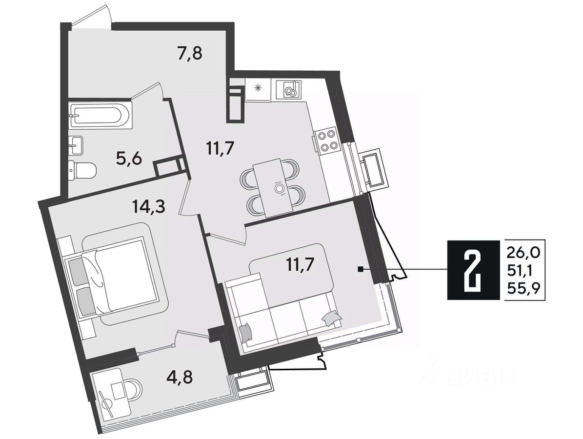 Срок сдачи: 1 кв. 2026, общей площадью 56.6 кв.м., на 17 этаже.