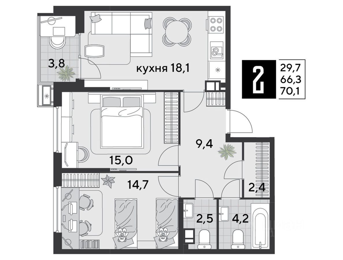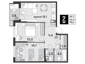 Срок сдачи: 1 кв. 2026, общей площадью 69.8 кв.м., на 7 этаже.
