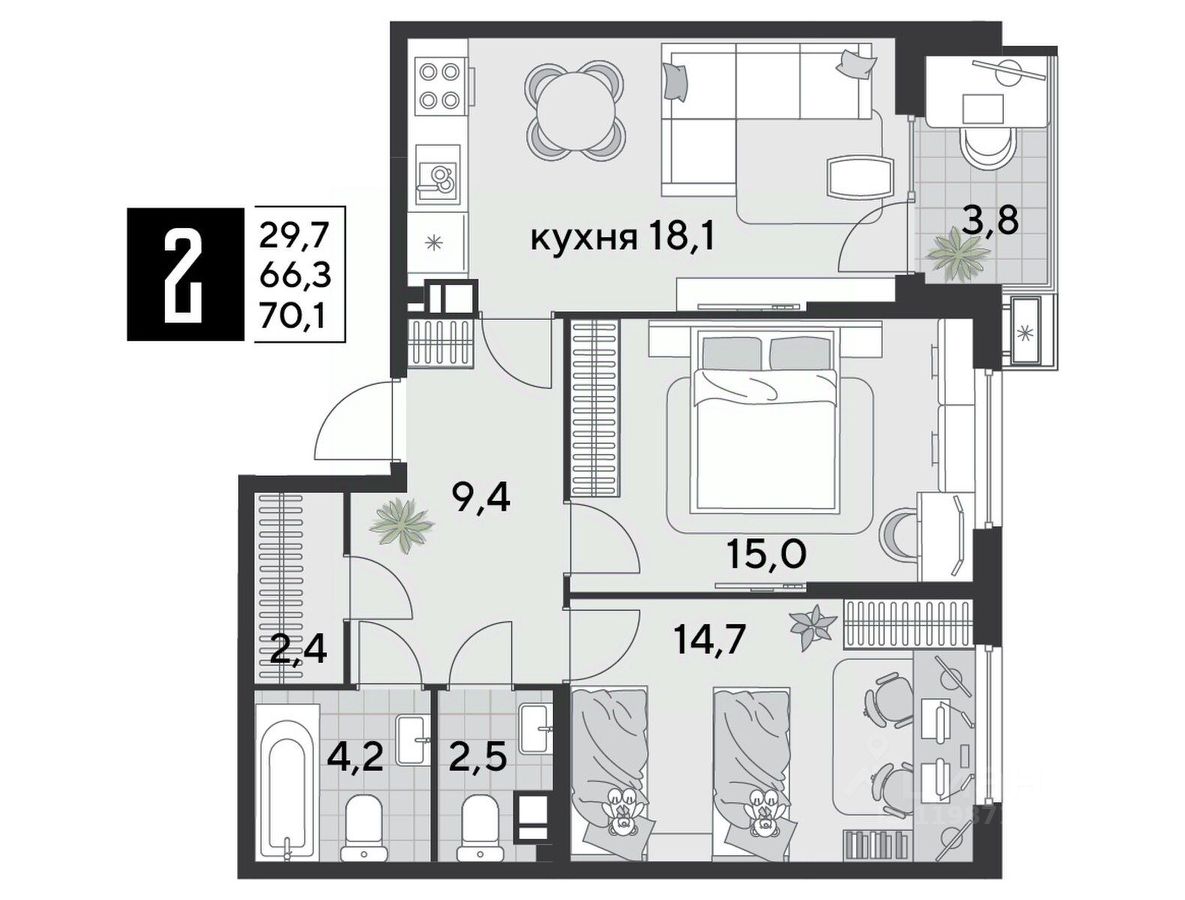 Срок сдачи: 1 кв. 2026, общей площадью 70.2 кв.м., на 4 этаже.