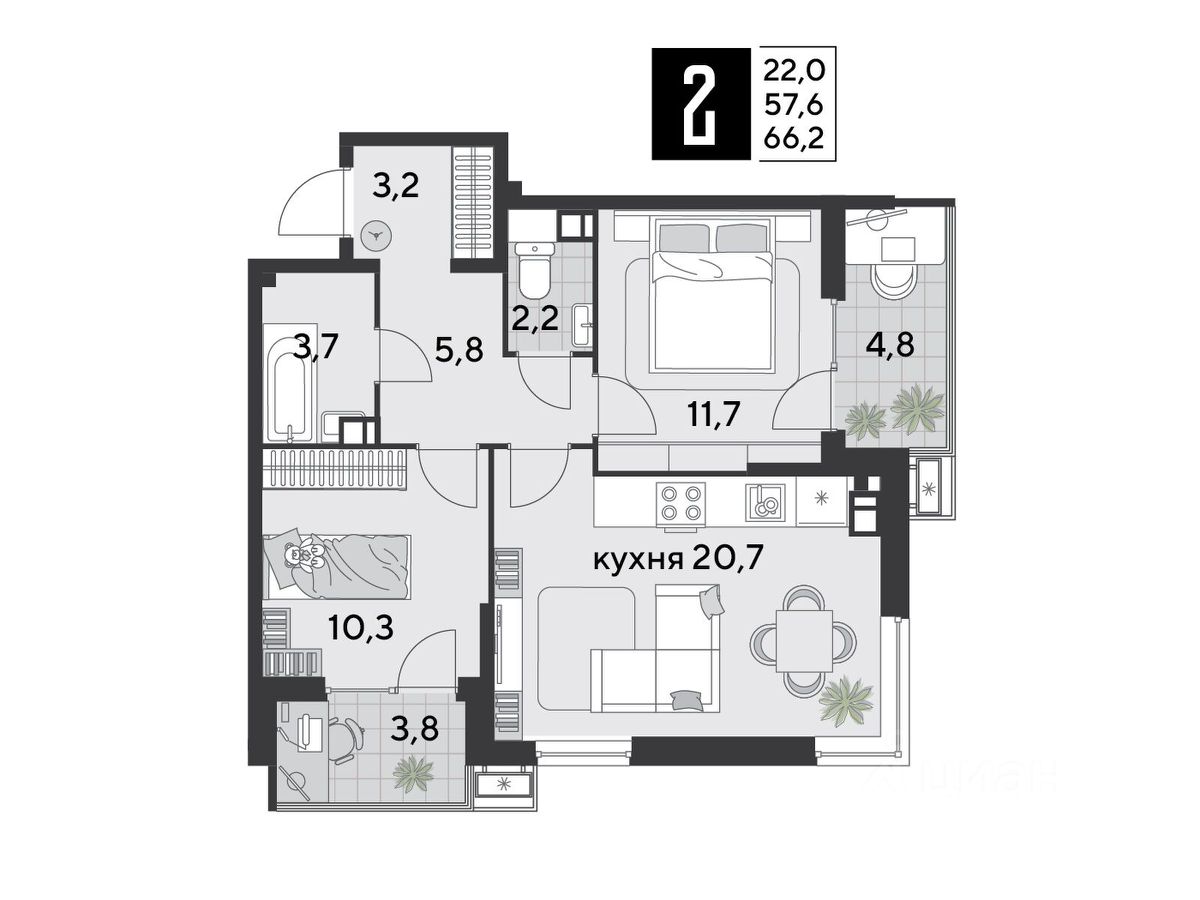 Срок сдачи: 1 кв. 2026, общей площадью 66.2 кв.м., на 3 этаже.