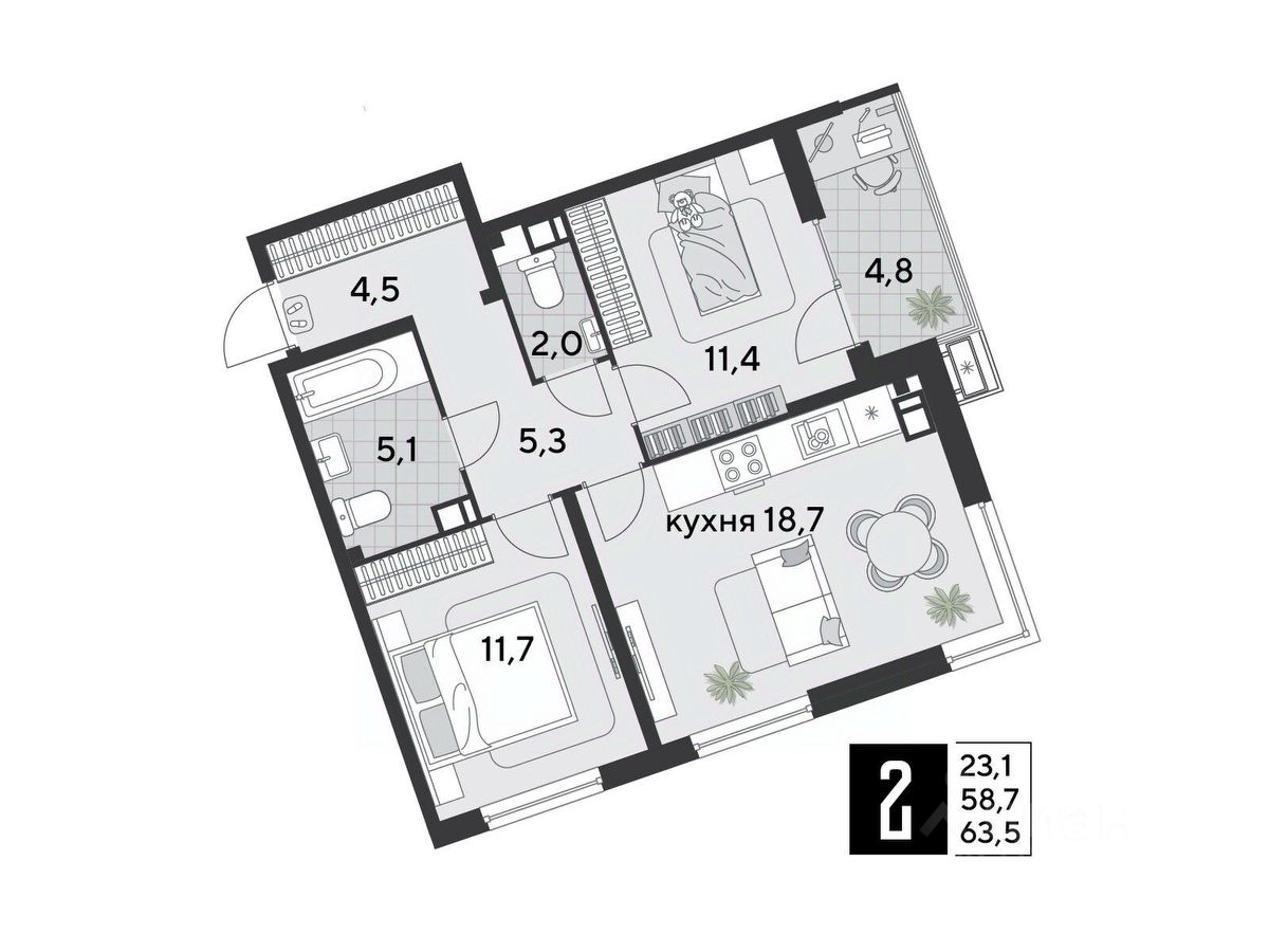 Срок сдачи: 1 кв. 2026, общей площадью 63.5 кв.м., на 3 этаже.