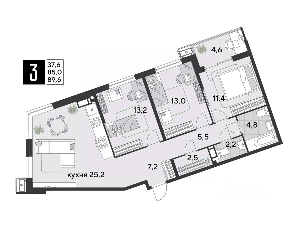 Срок сдачи: 1 кв. 2026, общей площадью 89.6 кв.м., на 10 этаже.