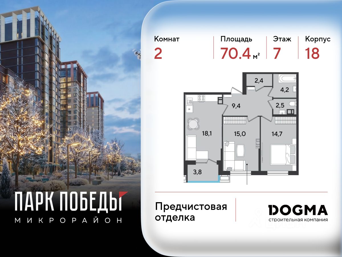 Срок сдачи: 1 кв. 2026, общей площадью 70.4 кв.м., на 7 этаже.