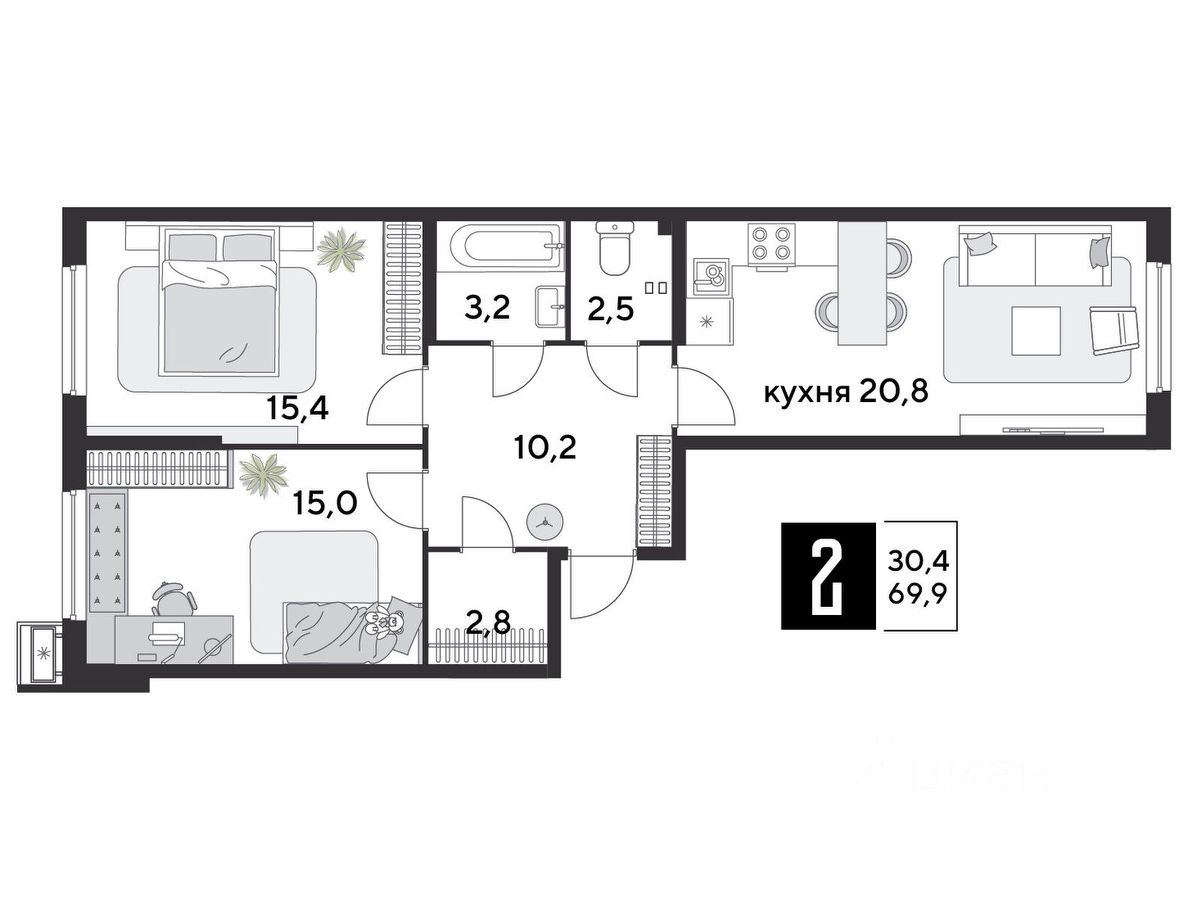 Срок сдачи: 1 кв. 2026, общей площадью 69.9 кв.м., на 8 этаже.
