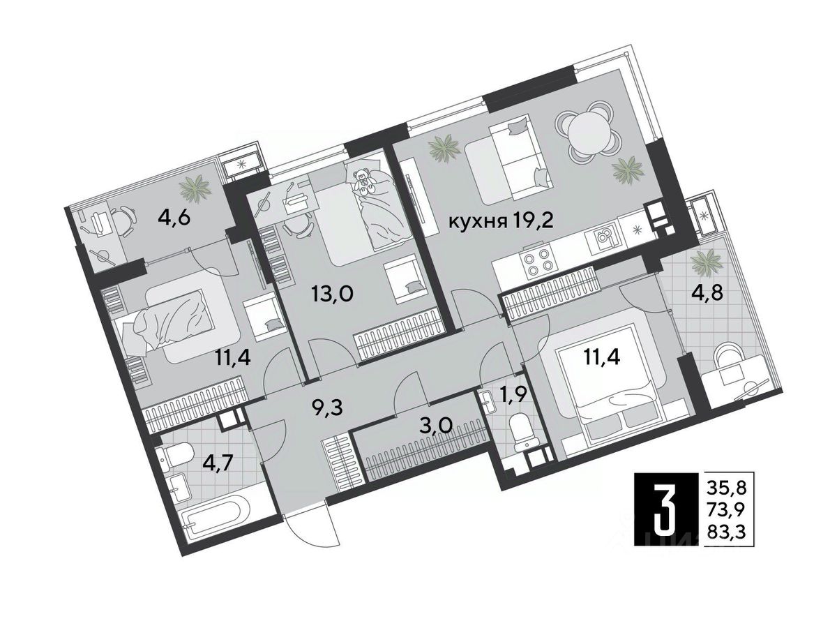 Срок сдачи: 1 кв. 2026, общей площадью 83.3 кв.м., на 3 этаже.