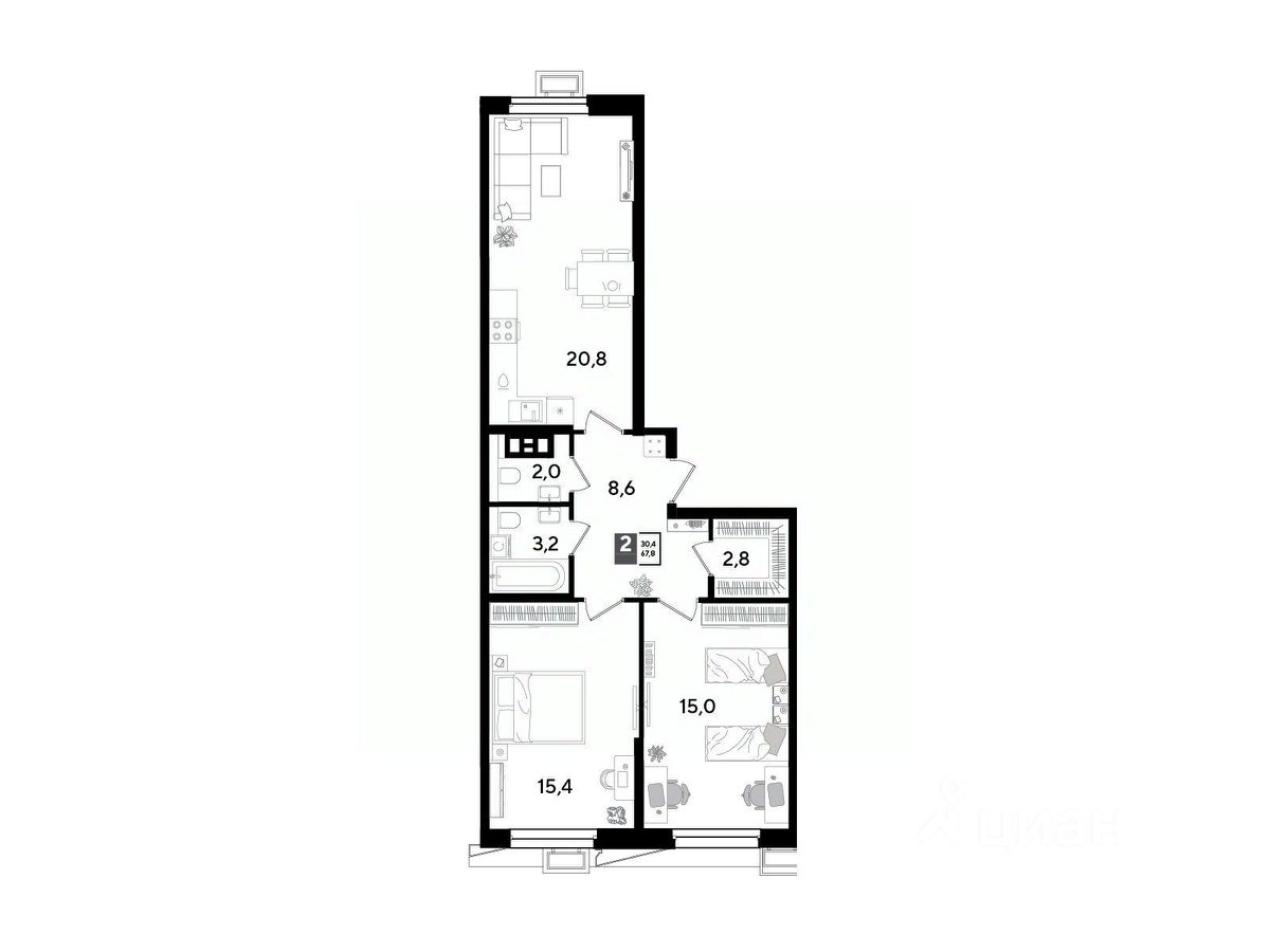 Срок сдачи: 1 кв. 2026, общей площадью 67.8 кв.м., на 9 этаже.