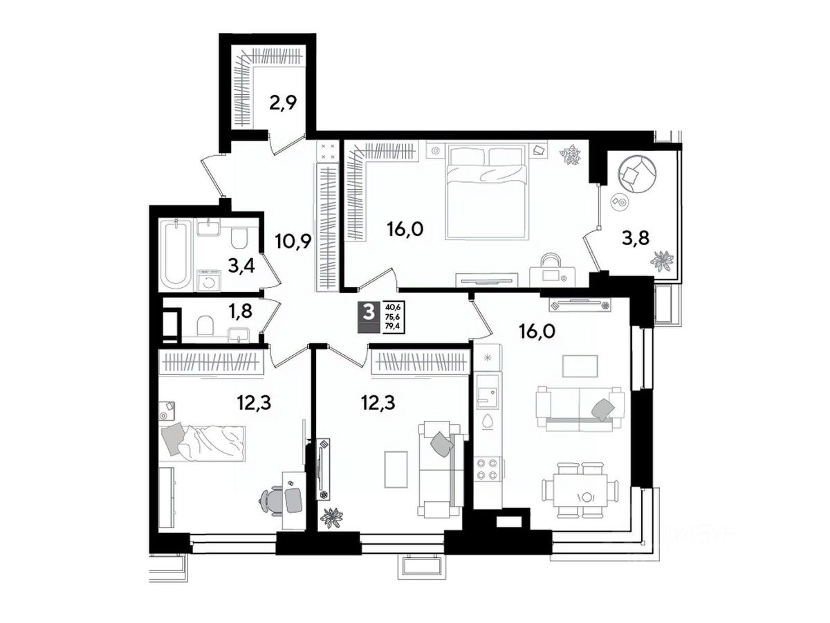 Срок сдачи: 1 кв. 2026, общей площадью 79.4 кв.м., на 13 этаже.