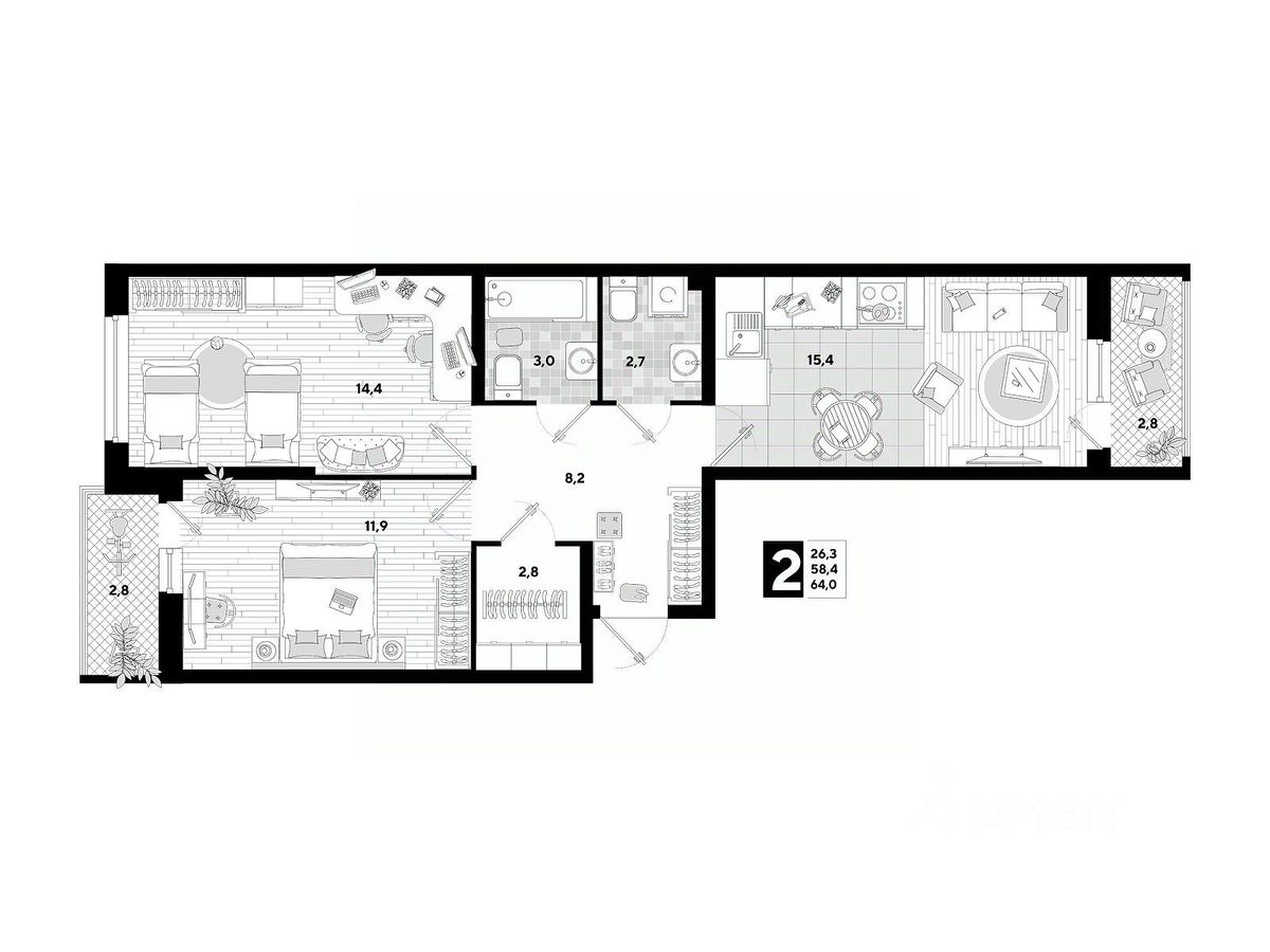 В продаже 2-комнатная квартира от застройщика! Мкр. "Самолет" 4 очередь, г. Краснодар, Литер 23 Срок сдачи: 4 кв. 2023, общей площадью 64 кв.м., на 2 этаже.