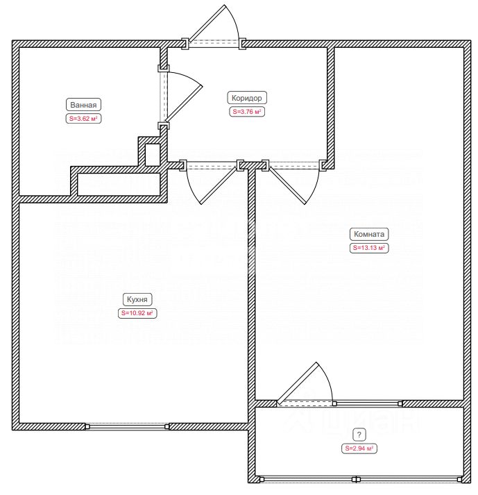 Площадь объекта 31,8м2. Высота потолка 2,8м. Кухня 10,9м2. Комната 13,1м2.