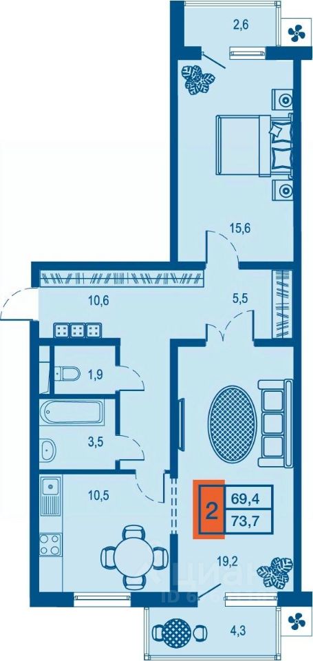 Общая площадь69,4 м²