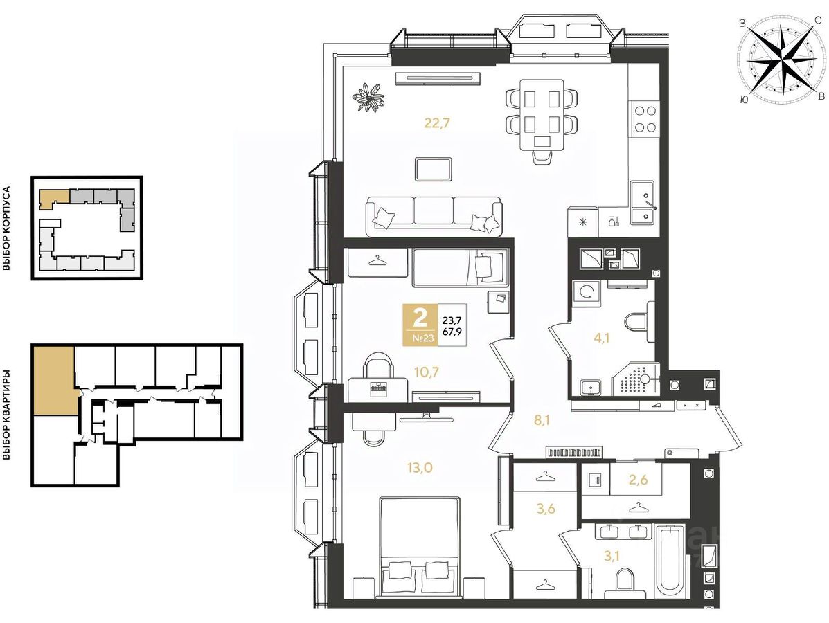 Продаётся 2-комнатная квартира от застройщика DOGMA . Основные характеристики: Площадь: 67.90 кв . м Отделка: с отделкой white box Расположение: город Краснодар, улица Западный обход . Жилой комплекс: новый жилой квартал бизнес - класса "Самолёт 7" . "Самолёт 7" - это квартал бизнес-класса в рамках крупнейшего микрорайона в России. Это проект, который сочетает в себе: отличную инфраструктуру; хорошую транспортную доступность; живописный пейзаж. Здесь история успеха встречается с амбициями будущего. Проект вдохновлен колоритом кубанских рек и лесов, гармонично подчиняя природу общему архитектурному замыслу. Преимущества жилого квартала "Самолёт 7". Транспортная доступность 10+ остановок общественного транспорта в шаговой доступности. 15 минут на автобусе до Ботанического сада имени И. Косенко. 15 минут на автомобиле до Елизаветинского шоссе. 19 минут на автомобиле до центральной Красной улицы. Динамичная архитектура Архитектура каскадного строительства вдохновлена золотистыми кубанскими полями и серебристыми реками. Ключевые особенности: Монолитно-кирпичные технологии с использованием системы Cuuber. Безупречно гладкие навесные вентилируемые фасады благородного оттенка латуни. Стекла с напылением, дарящие абсолютную приватность. Высококачественные материалы, гарантирующие прочность и долговечность. Равномерная вечерняя подсветка, подчеркивающая геометрию здания. Гранд-лобби Персональный клуб для резидентов - это пространство, которое подходит для всех жителей, включая людей с особыми потребностями. Интерьеры впечатляют современностью и вкусом. Внутреннее наполнение: Зона ресепшн. Камерные лаунж-зоны и мягкая мебель. Помещения для хранения и колясочные. Гостевой санузел. Особый колорит придают: Потолки высотой 3,9 метра. Окна в пол. Лифтовые порталы с латунными вставками. Собственная река Собственная река, протекающая через весь квартал, геопластика рельефа и двор-сад в японском стиле создают приватное пространство - отражение личных смыслов и ощущений. Перголы, увитые зеленью, вечерняя подсветка фасадов и камерная атмосфера станут излюбленным местом для встреч в любое время. Внутренняя инфраструктура На первых этажах в каждом урбан-блоке созданы привилегированные пространства исключительно для жителей. Всего в квартале 2 закрытых клуба, каждый из которых находится на первом этаже рядом с гранд-лобби. Для резидентов предусмотрены: Консьерж-сервис, учитывающий даже самые взыскательные пожелания. Атмосферный кинотеатр. Фитнес-рум и кидс-клаб. Закрытая территория объединяет SportHub - уникальную локацию для любителей активного отдыха, а также включает детский сад на 280 мест и поликлинику. Технологии Территория закрыта для машин - здесь тихо и безопасно гулять с детьми. Системы безопасности и комфорта: Круглосуточное видеонаблюдение. Видеодомофоны для контроля доступа. Бесконтактный доступ по распознаванию лица или с помощью смартфона. Лифты, оборудованные "умным зеркалом" (где можно узнать погоду или новости). В общественных