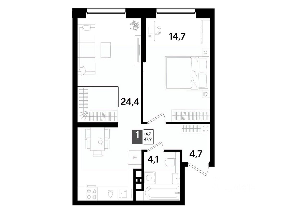 В продаже 1-комнатная квартира от застройщика! Мкр. "DOGMA PARK" г. Краснодар, Литер 31 Срок сдачи: 3 кв. 2027, общей площадью 47.9 кв.м., на 4 этаже.
