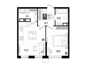 В продаже 1-комнатная квартира от застройщика! Мкр. "DOGMA PARK" г. Краснодар, Литер 31 Срок сдачи: 3 кв. 2027, общей площадью 44.1 кв.м., на 12 этаже.