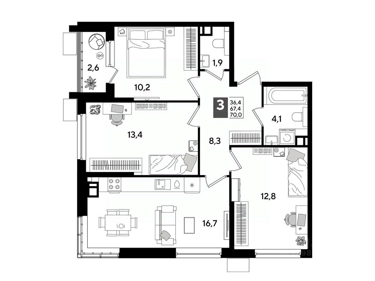 В продаже 3-комнатная квартира от застройщика! Мкр. "DOGMA PARK" г. Краснодар, Литер 20 Срок сдачи: 4 кв. 2027, общей площадью 70 кв.м., на 7 этаже.