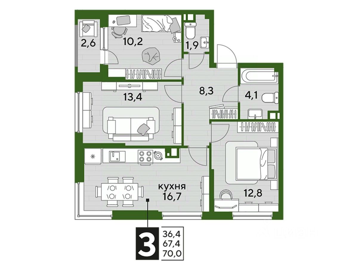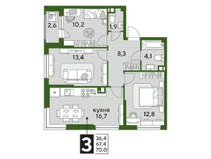 В продаже 3-комнатная квартира от застройщика! Мкр. "DOGMA PARK" г. Краснодар, Литер 18 Срок сдачи: 4 кв. 2027, общей площадью 70 кв.м., на 7 этаже.