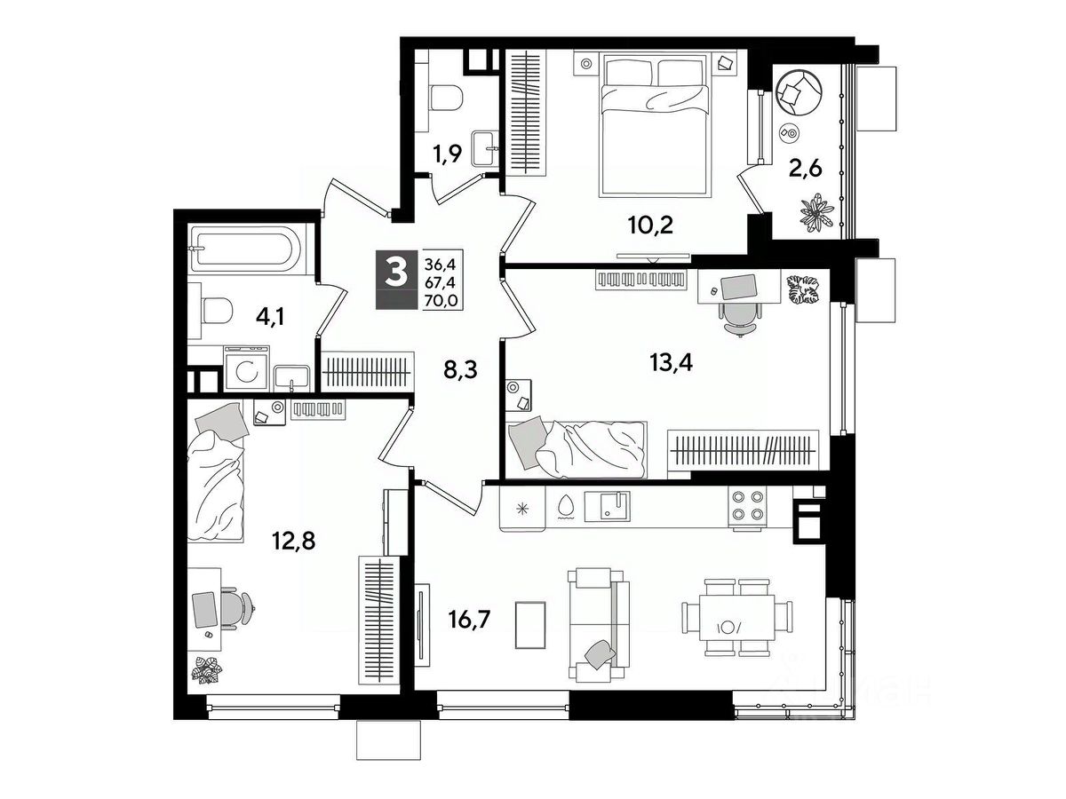 В продаже 3-комнатная квартира от застройщика! Мкр. "DOGMA PARK" г. Краснодар, Литер 16 Срок сдачи: 4 кв. 2027, общей площадью 70 кв.м., на 7 этаже.