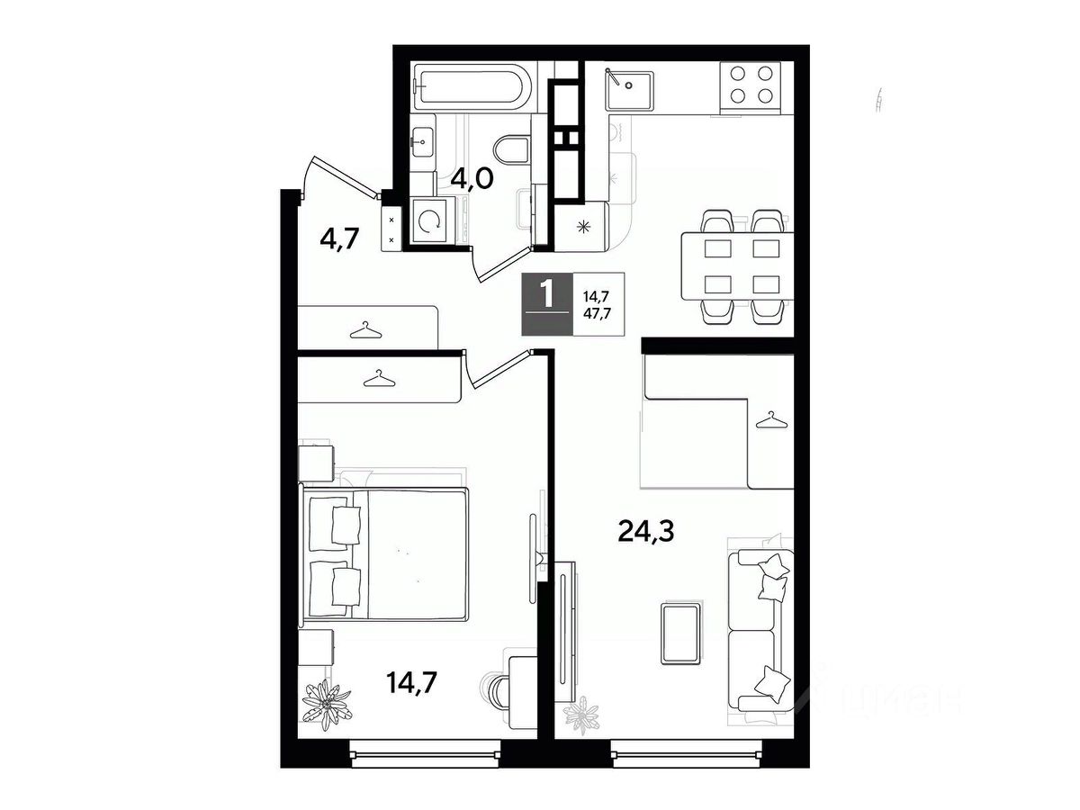 В продаже 1-комнатная квартира от застройщика! Мкр. "DOGMA PARK" г. Краснодар, Литер 23 Срок сдачи: 4 кв. 2027, общей площадью 47.7 кв.м., на 14 этаже.