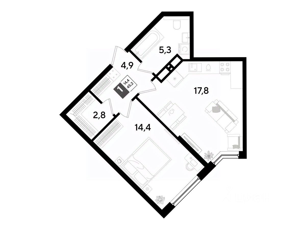 В продаже 1-комнатная квартира от застройщика! Мкр. "DOGMA PARK" г. Краснодар, Литер 30 Срок сдачи: 3 кв. 2027, общей площадью 45.2 кв.м., на 14 этаже.
