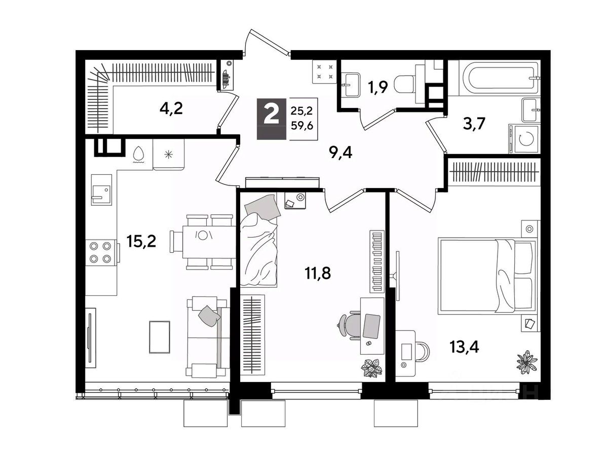 В продаже 2-комнатная квартира от застройщика! Мкр. "DOGMA PARK" г. Краснодар, Литер 36 Срок сдачи: 4 кв. 2027, общей площадью 59.6 кв.м., на 6 этаже.