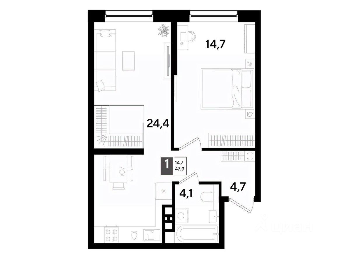 В продаже 1-комнатная квартира от застройщика! Мкр. "DOGMA PARK" г. Краснодар, Литер 34 Срок сдачи: 4 кв. 2027, общей площадью 47.9 кв.м., на 4 этаже.