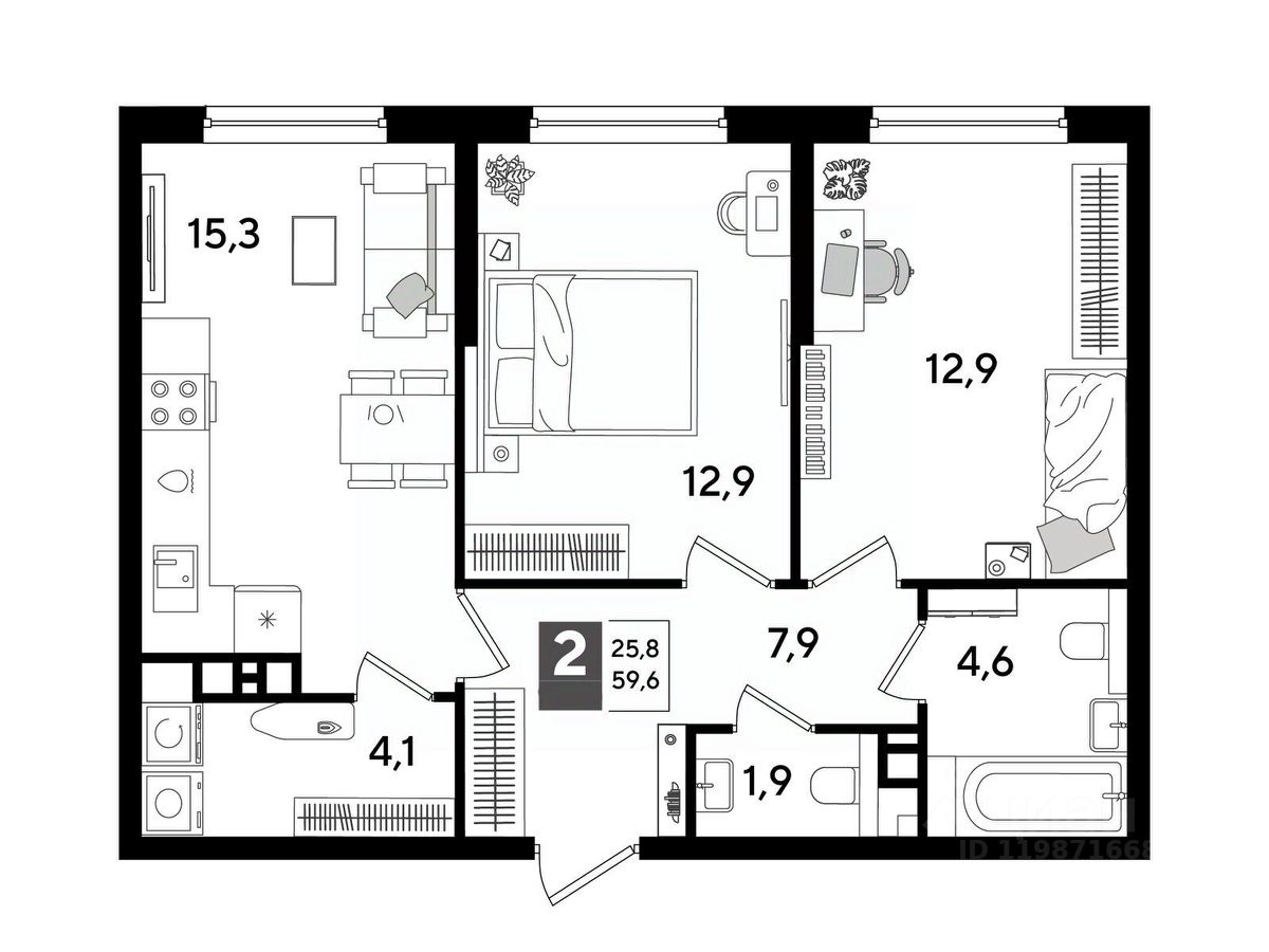 В продаже 2-комнатная квартира от застройщика! Мкр. "DOGMA PARK" г. Краснодар, Литер 34 Срок сдачи: 4 кв. 2027, общей площадью 59.6 кв.м., на 6 этаже.