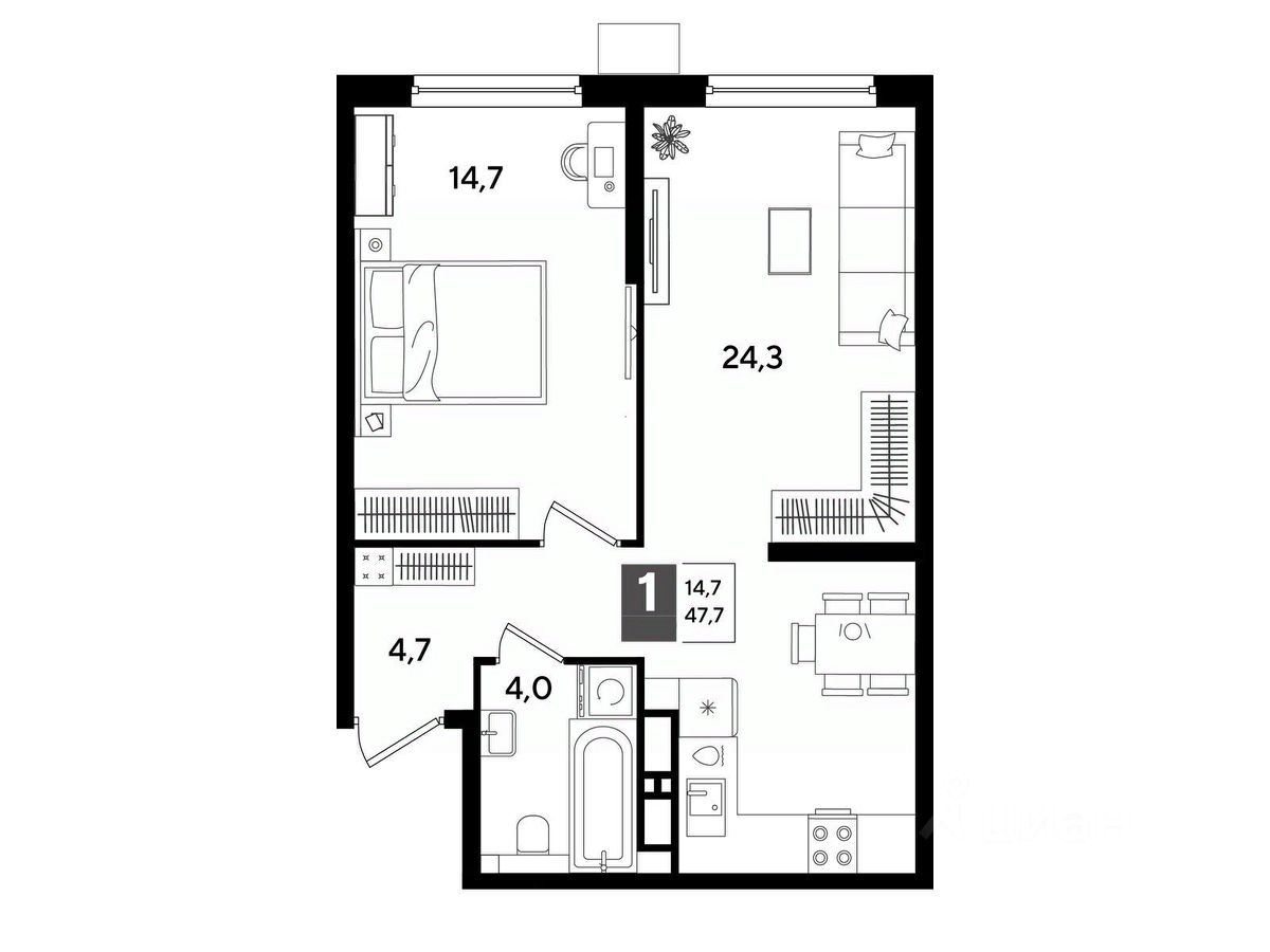 В продаже 1-комнатная квартира от застройщика! Мкр. "DOGMA PARK" г. Краснодар, Литер 34 Срок сдачи: 4 кв. 2027, общей площадью 47.7 кв.м., на 12 этаже.