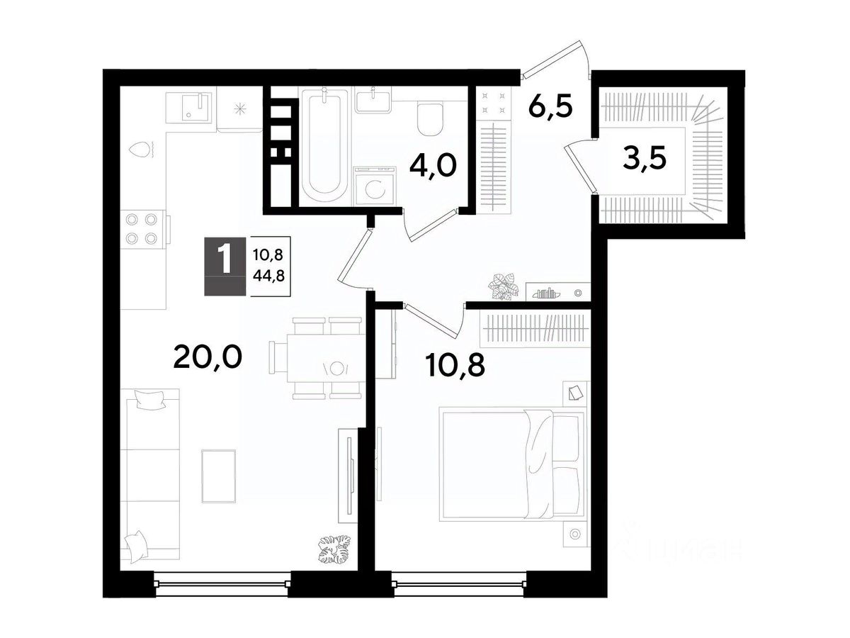 В продаже 1-комнатная квартира от застройщика! Мкр. "DOGMA PARK" г. Краснодар, Литер 34 Срок сдачи: 4 кв. 2027, общей площадью 44.8 кв.м., на 14 этаже.