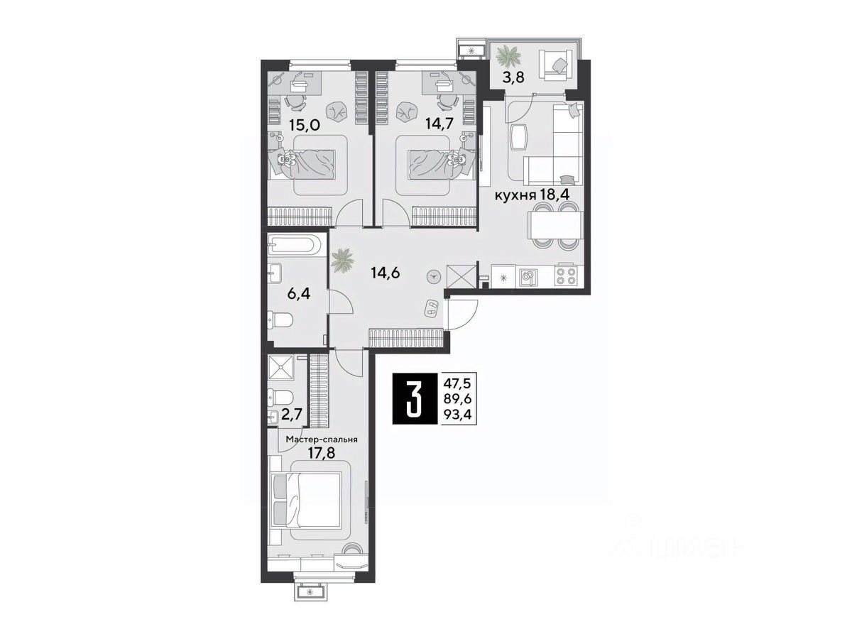 Срок сдачи: 4 кв. 2025, общей площадью 93.4 кв.м., на 2 этаже.