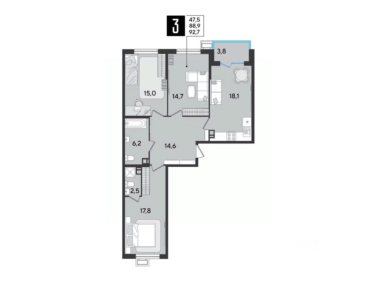 Срок сдачи: 4 кв. 2025, общей площадью 92.7 кв.м., на 5 этаже.
