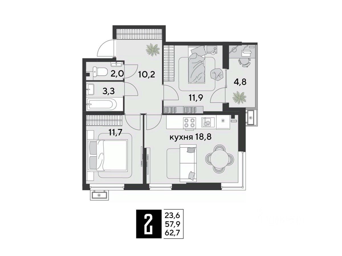 Срок сдачи: 4 кв. 2025, общей площадью 62.7 кв.м., на 2 этаже.