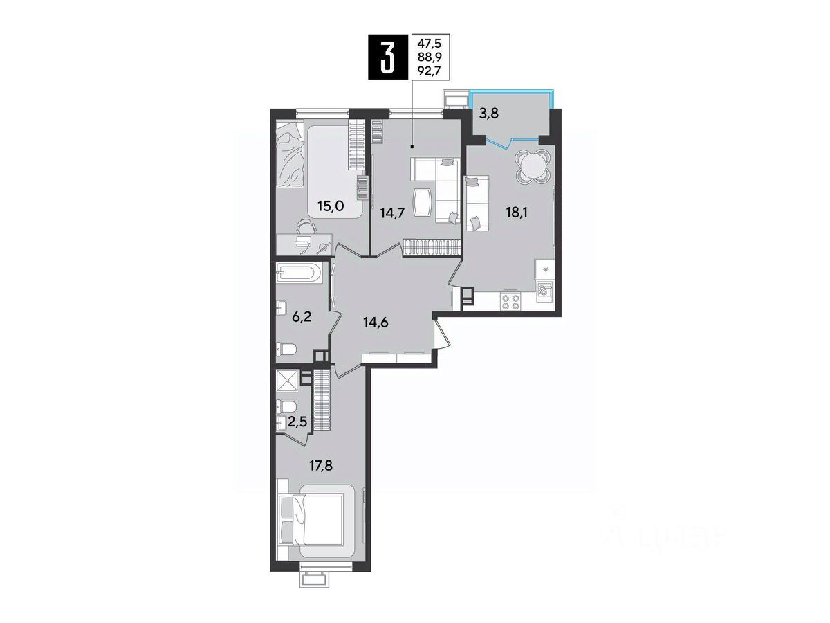 Срок сдачи: 4 кв. 2025, общей площадью 92.7 кв.м., на 4 этаже.