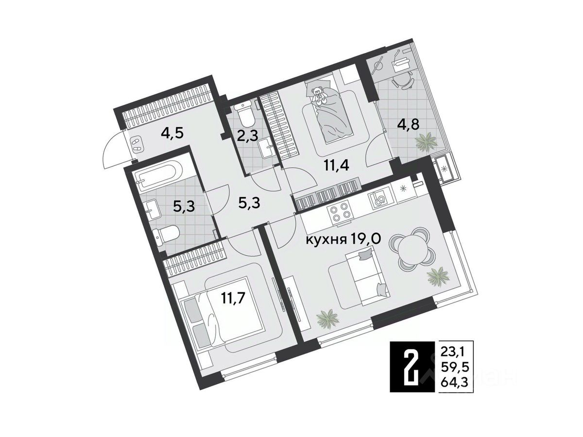 Срок сдачи: 1 кв. 2026, общей площадью 64.3 кв.м., на 2 этаже.