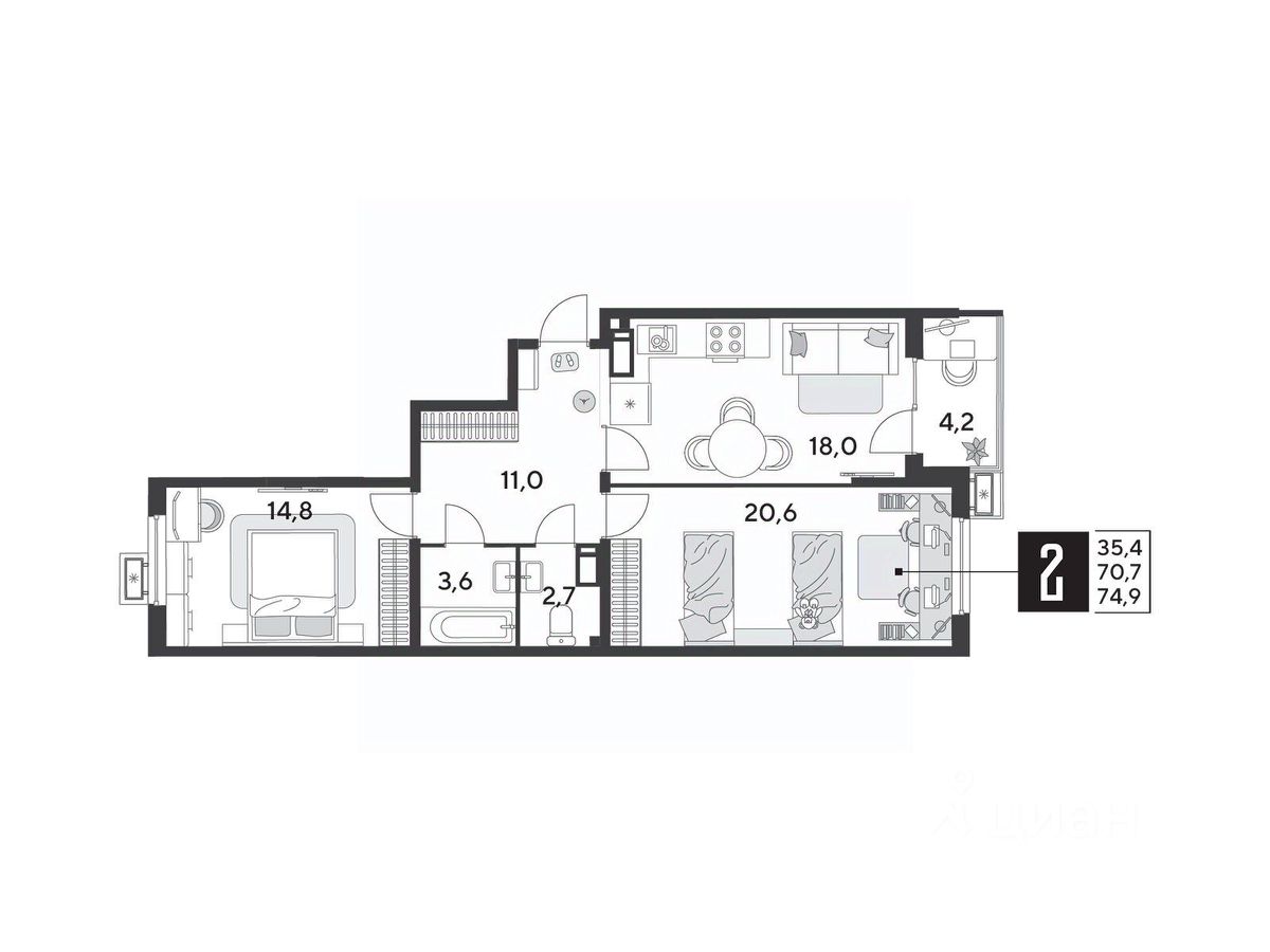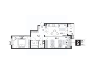 Срок сдачи: 1 кв. 2026, общей площадью 74.9 кв.м., на 11 этаже.